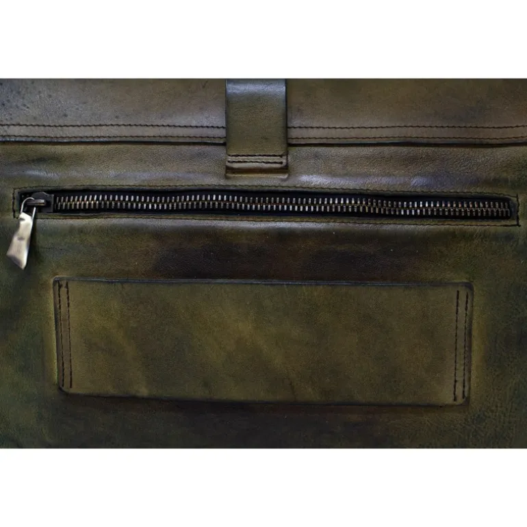 Na zewnątrz: Pasek z możliwością regulowania długości, pozwala on nosić teczkę na ramieniu lub tak jak plecak, podwójne zapięcie: przycisk zamknięcia oraz klips. Wykonana ze skór bawolich garbowanych roślinnie. Po etapie wykrojenia oraz zszycia teczki, zostaje ona zanurzona w specjalnym roztworze, co pozwala nadać jej trwały kolor. Następnie jest ona poddawana naturalnemu procesowi suszenia, podczas którego odzyskuje pierwotny kształt.
