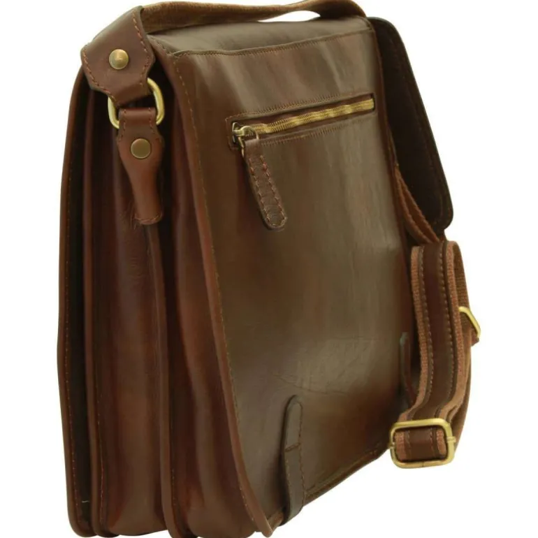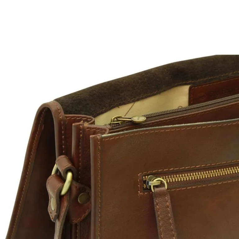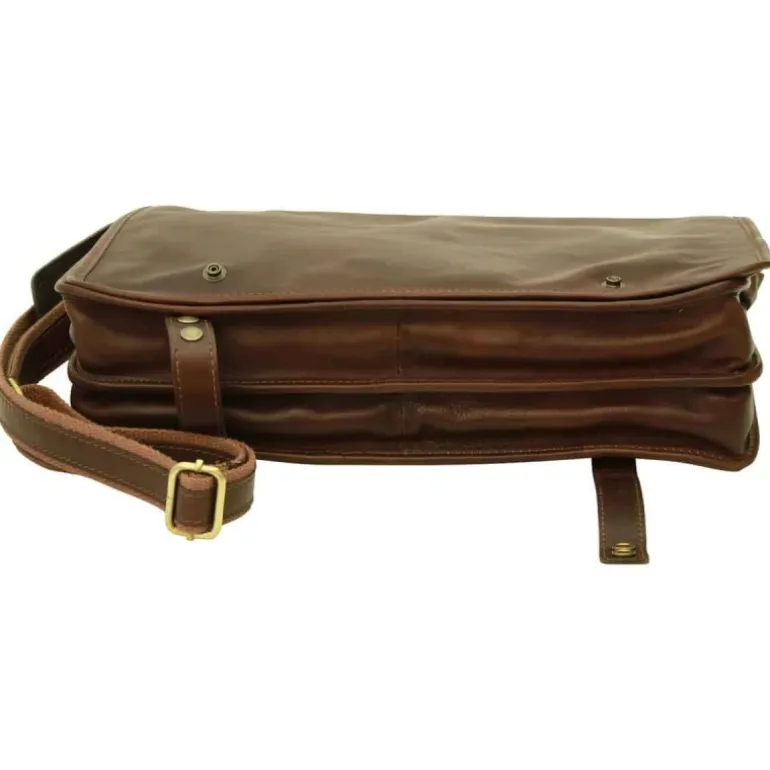 Torba męska na ipad z włoskiej skóry cielęcej, brązowy ciemny kolor, klasyczna, pojemna i wszechstronna. Wewnątrz posiada bawełnianą podszewkę, przestronną komorę środkową, zewnętrzną kieszeń zapinaną na zamek oraz regulowany pasek na ramię z oparciem na ramię.