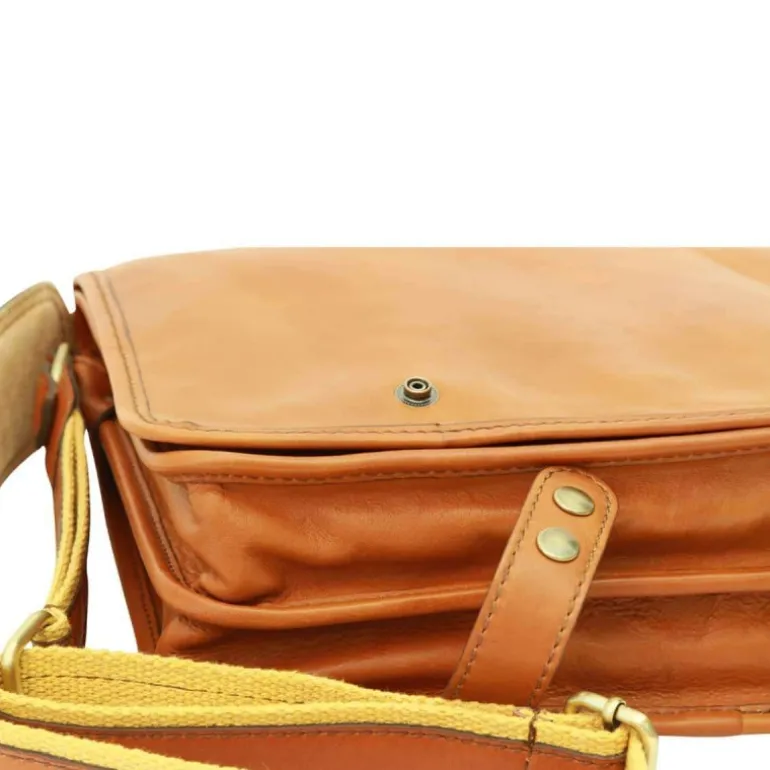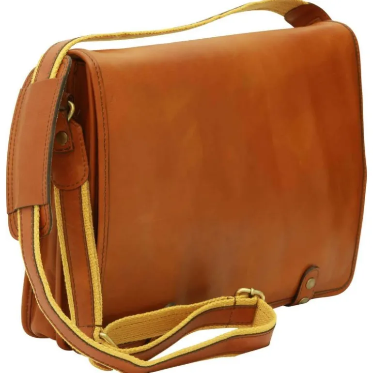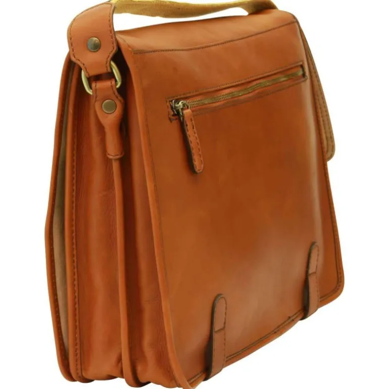 Torba męska na ipad z włoskiej skóry cielęcej, koniakowy kolor, klasyczna, pojemna i wszechstronna. Wewnątrz posiada bawełnianą podszewkę, przestronną komorę środkową, zewnętrzną kieszeń zapinaną na zamek oraz regulowany pasek na ramię z oparciem na ramię.