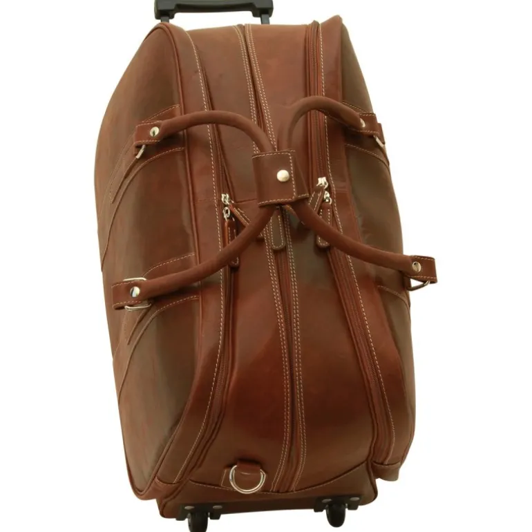 „Płock” torba podróżna skórzana na kółkach brązowy. Podszewka bawełniana, trzy komory, kieszeń wewnętrzna na suwak, pasek z możliwością regulowania długości + karabińczyki.