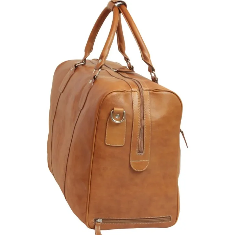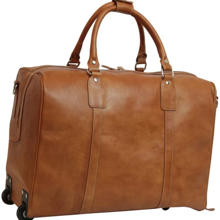 Torba podróżna skórzana na kółkach koniak, podszewka bawełniana, Jedna komora, Kieszeń wewnętrzna na suwak, Z przodu kieszeń na suwak, Pasek z możliwością regulowania długości + karabińczyki. Wymiary: 50x35x22 cm. Waga: 3,100 kg.