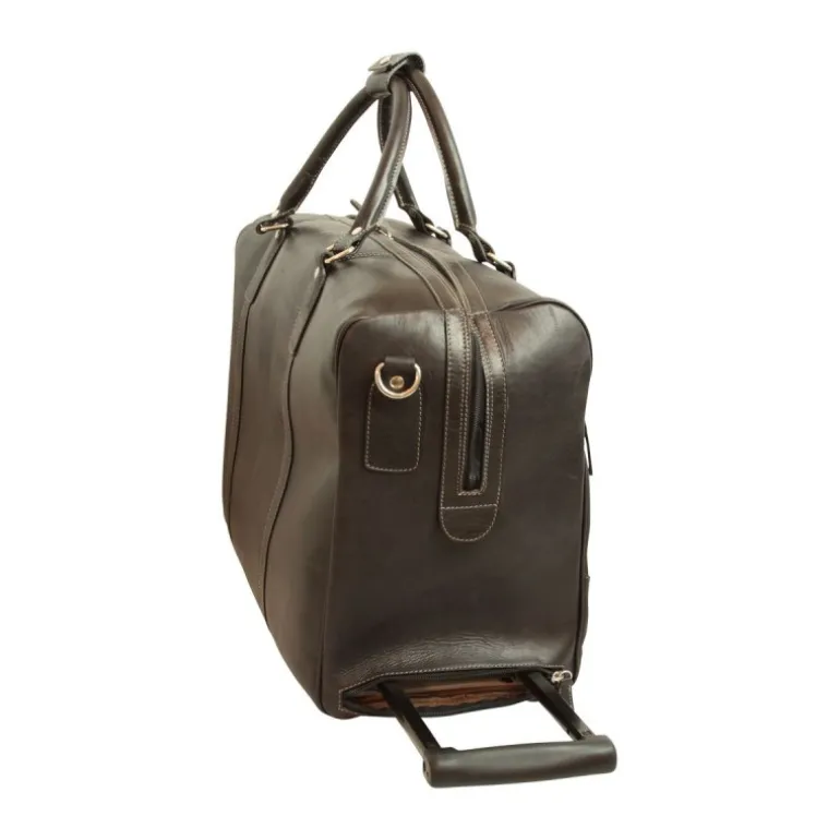 Torba podróżna skórzana na kółkach czarny, podszewka bawełniana, Jedna komora, Kieszeń wewnętrzna na suwak, Z przodu kieszeń na suwak, Pasek z możliwością regulowania długości + karabińczyki. Wymiary: 50x35x22 cm. Waga: 3,100 kg.