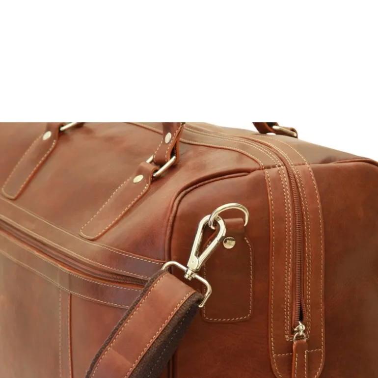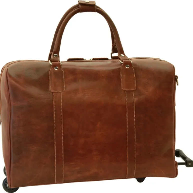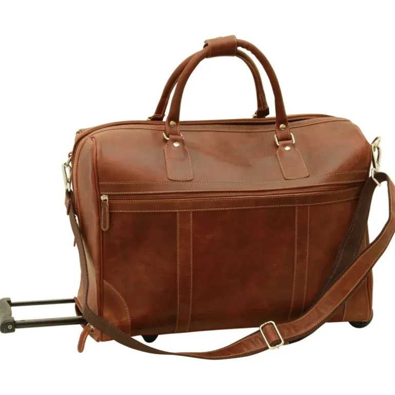 Torba podróżna skórzana na kółkach brązowa, podszewka bawełniana, Jedna komora, Kieszeń wewnętrzna na suwak, Z przodu kieszeń na suwak, Pasek z możliwością regulowania długości + karabińczyki. Wymiary: 50x35x22 cm. Waga: 3,100 kg.