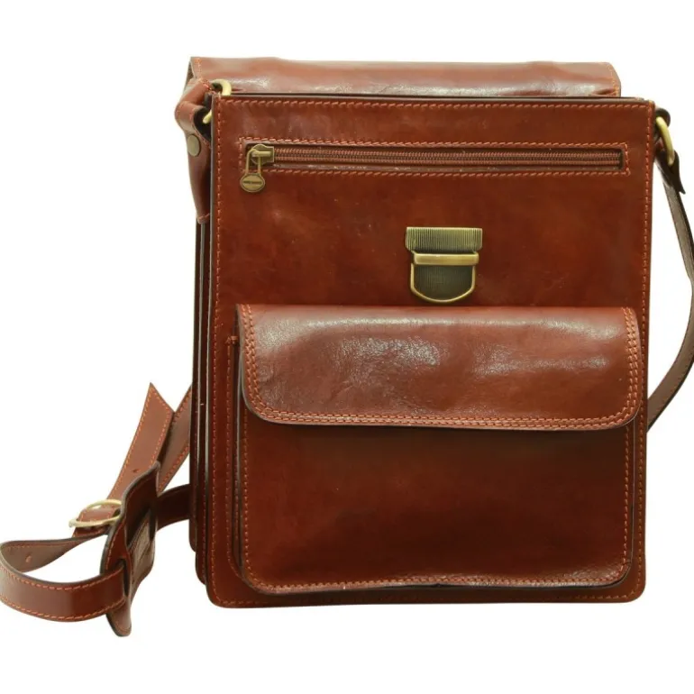Torba saszetka męska skórzana z podszewka ze skóry. 2 komory. Kieszonka na telefon wewnątrz. Kieszonka na suwak pod klapką z przodu. Zamknięcie na klucz. Pasek z możliwością regulowania długości z nakładką. Wymiary: 23x27x10 cm. Waga: 1,000 kg