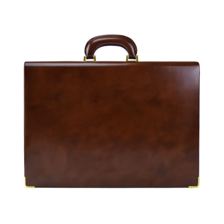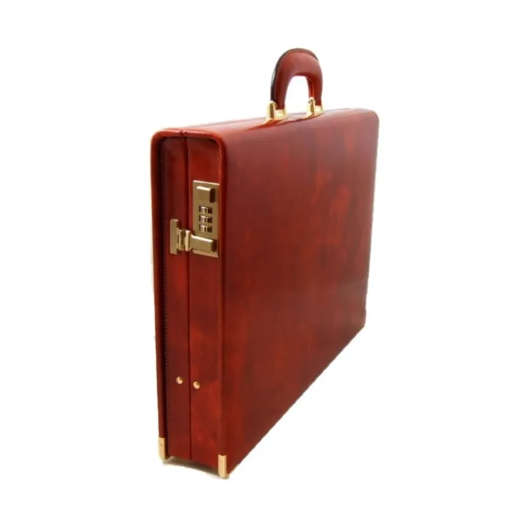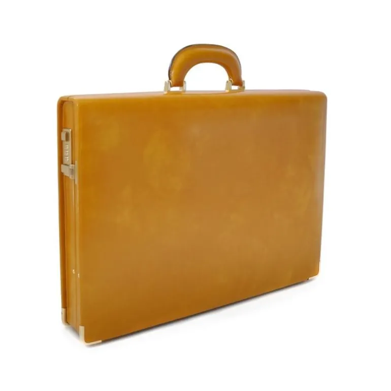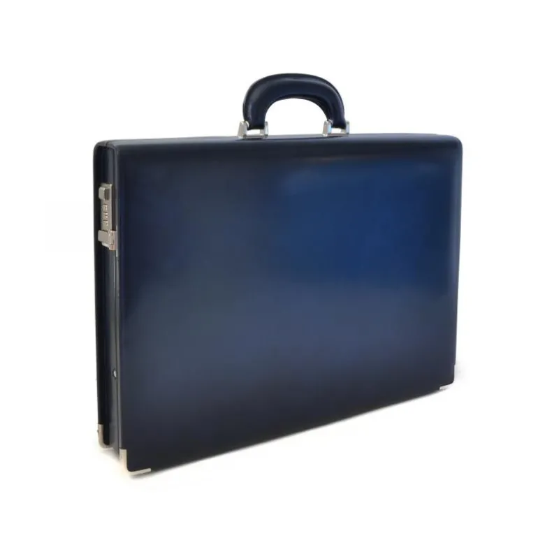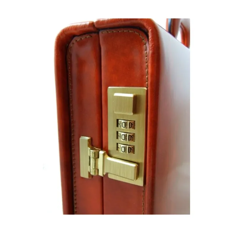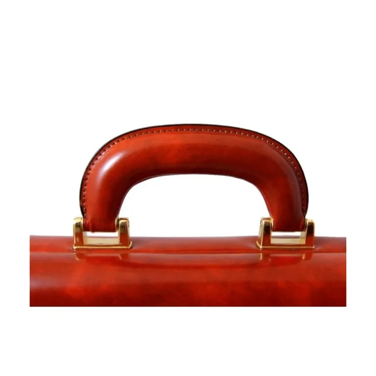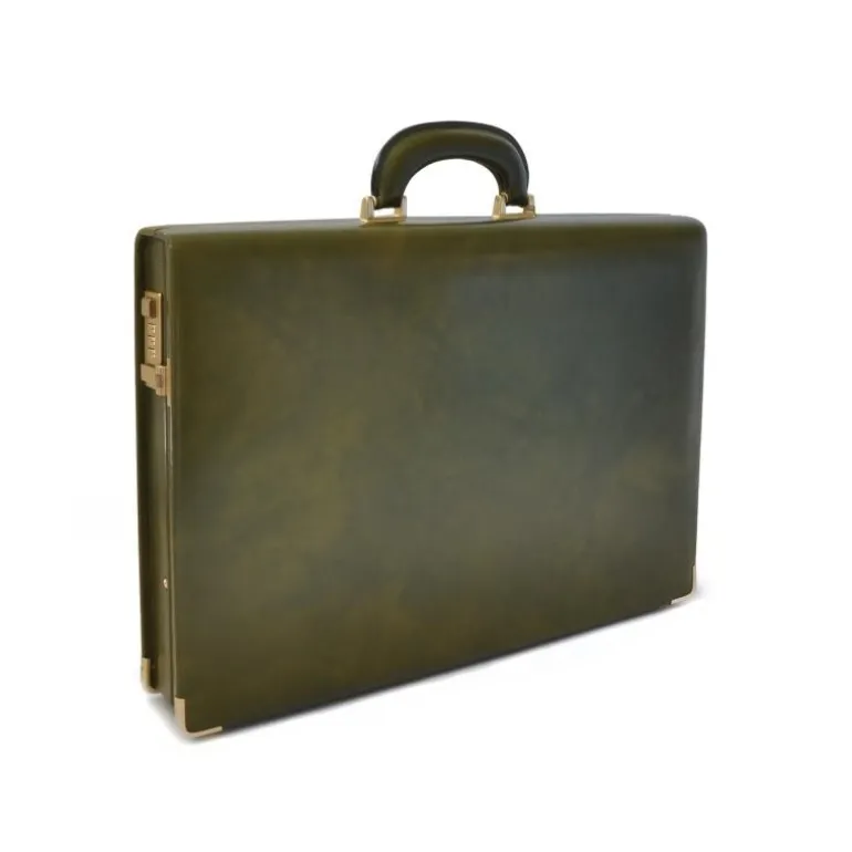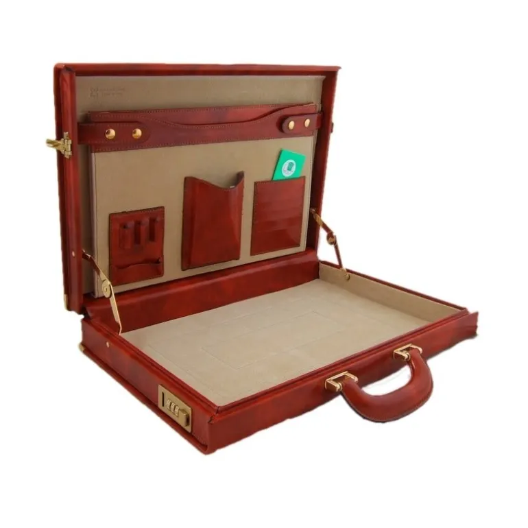 Walizka 24H została wykonana ze skóry szlachetnej garbowanej roślinnie i farbowanej ręcznie. Wewnątrz komora na dokumenty przedzielona, kieszonka na telefon komórkowy, szlufki na długopisy i kieszonka na wizytówki. Zamknięcie na kombinacje numeryczne z mosiądzu umieszczone po bokach, co nadaje walizce elegancki wygląd. W wyposażeniu bawełniany worek.