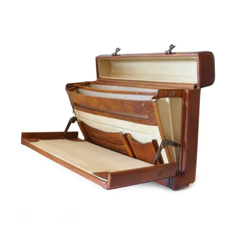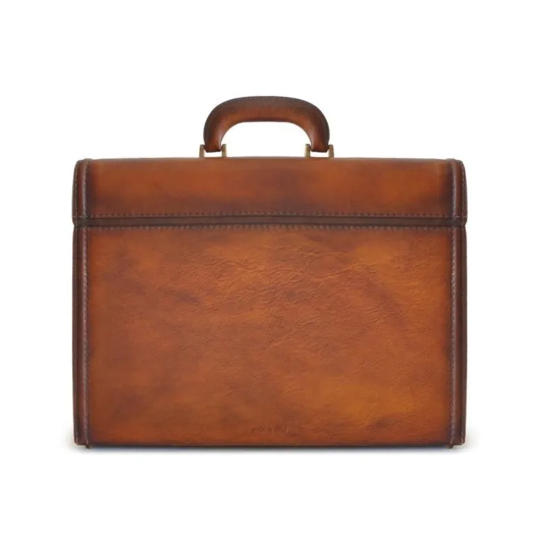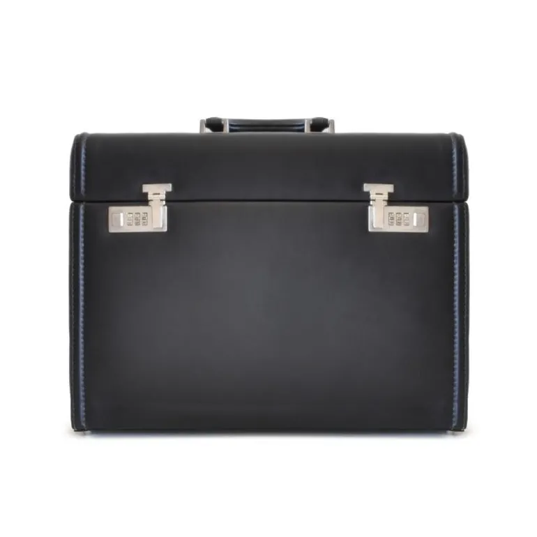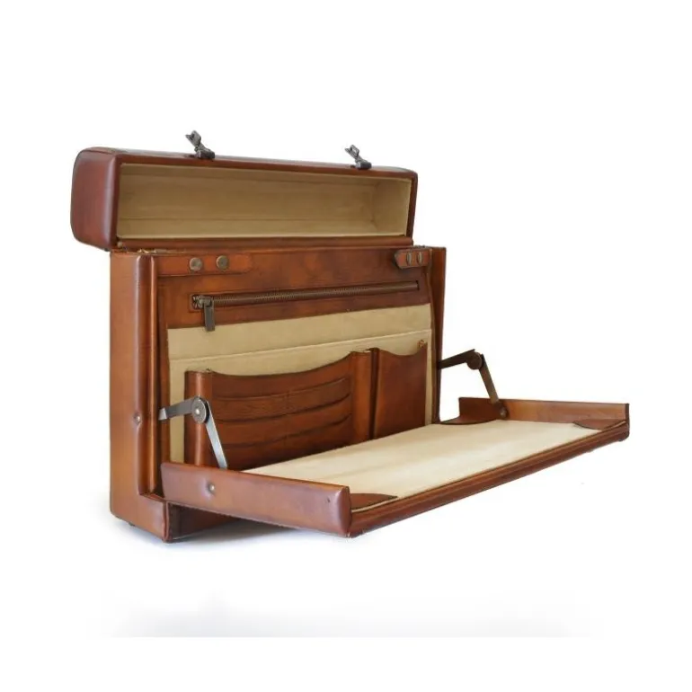 Materiał Skóra cielęca. Szerokość 42 cm. Wysokość 32 cm. Głębokość 9 cm. Uchwyt Metal pokryty skórą. Części metalowe Mosiądz. Zamknięcie 2 zamknięcia numeryczne. Waga kg 2,5
