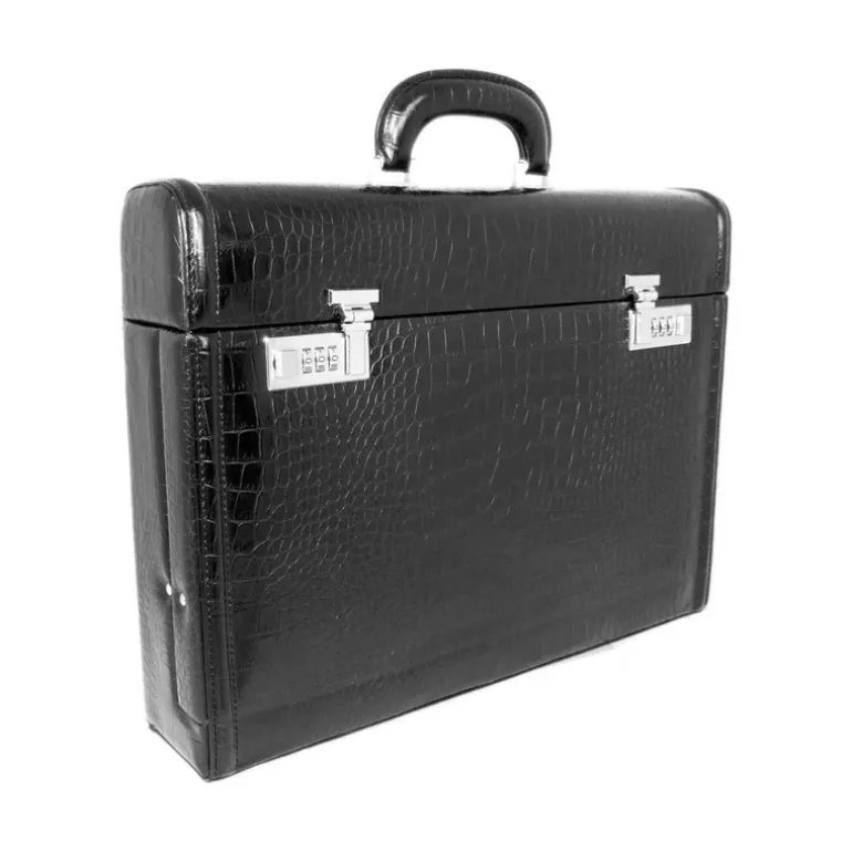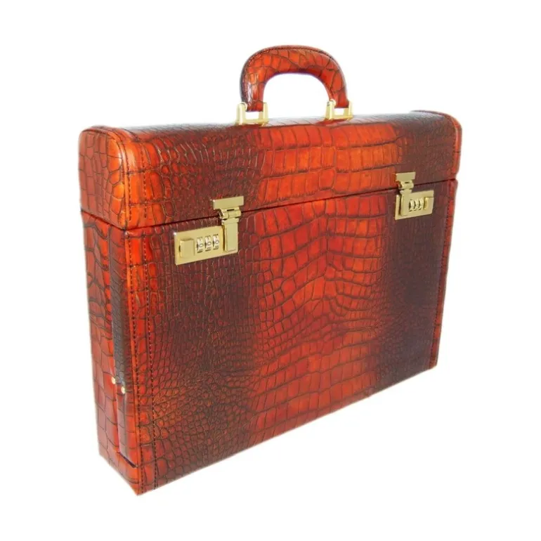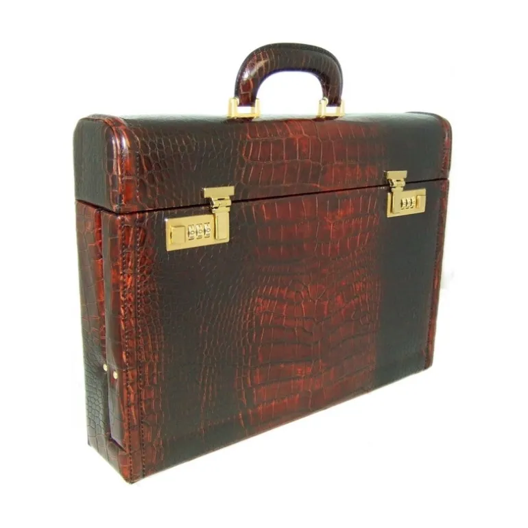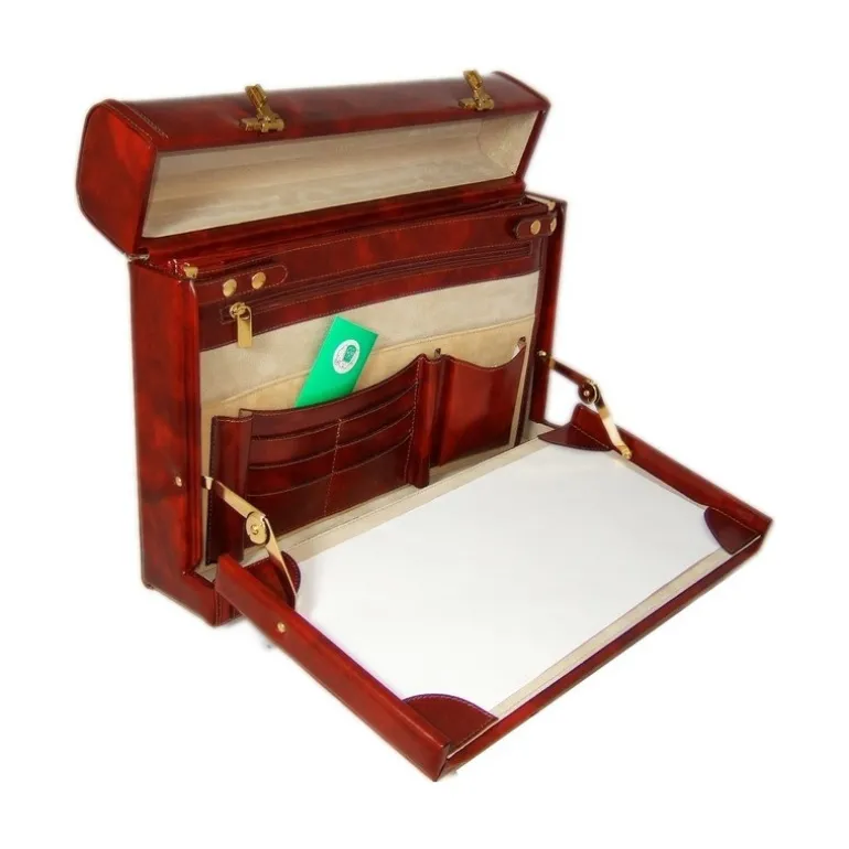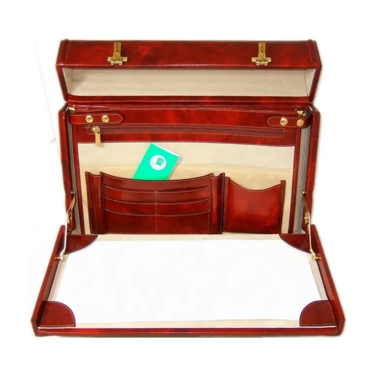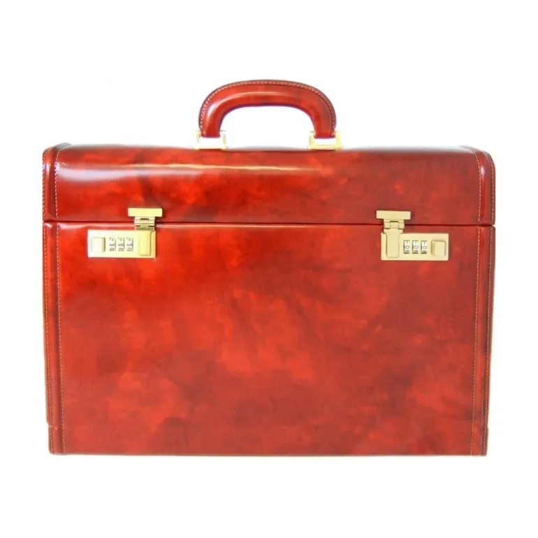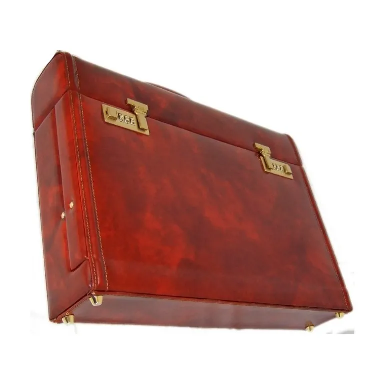 Materiał Skóra cielęca. Szerokość 42 cm. Wysokość 32 cm. Głębokość 9 cm. Uchwyt Metal pokryty skórą. Części metalowe Mosiądz. Zamknięcie 2 zamknięcia numeryczne.Waga kg 2,5