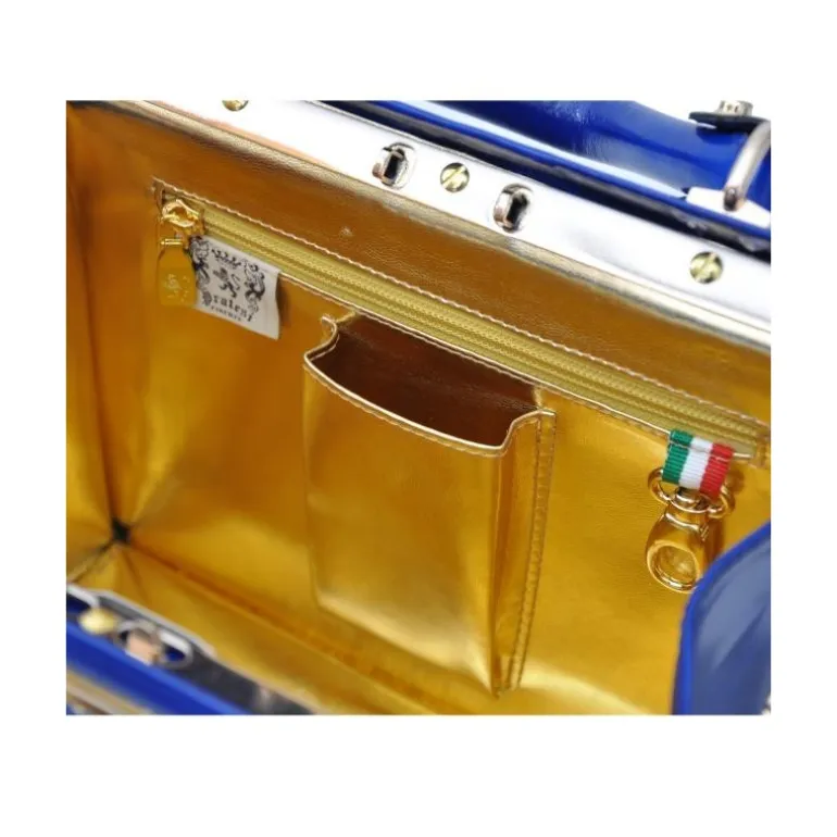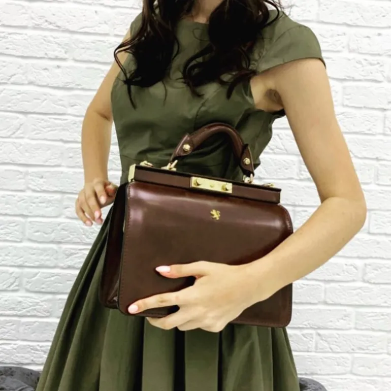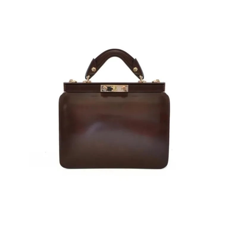 Materiał Skóra cielęca. Szerokość 28 cm. Wysokość 22 cm. Głębokość 8,5 cm. Rączka/Pasek Ze skóry. Części metalowe Mosiądz. Zamknięcie Na automatyczne zatrzaski. Waga kg 0,700.