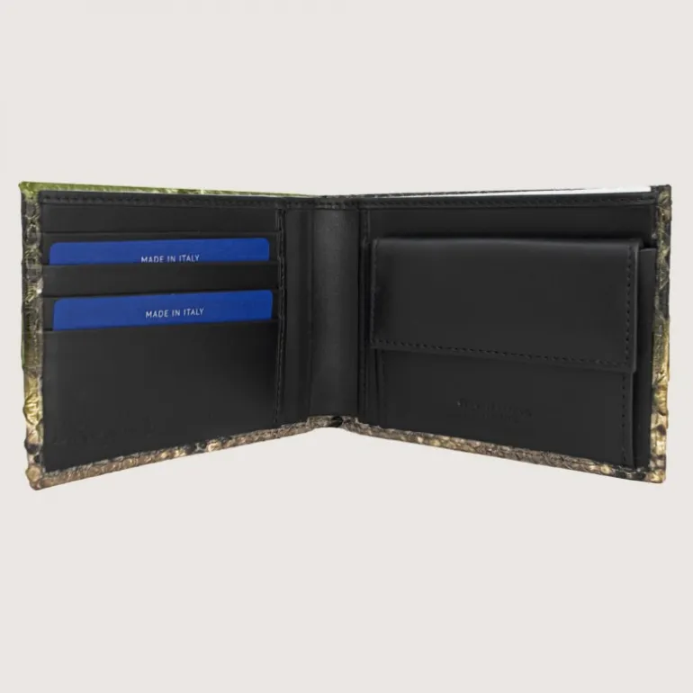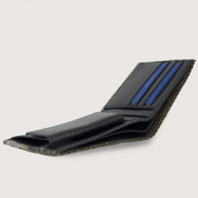 Zielony portfel z prawdziwej skóry pytona z kieszonką na monety, w całości wykonany ręcznie. Wygodna i praktyczna zarówno do marynarki, jak i do noszenia w kieszeni spodni. Całość wykonana ręcznie z wysokiej jakości materiałów. Luksusowy i elegancki przedmiot. Zielony bufor w cieniu błota.