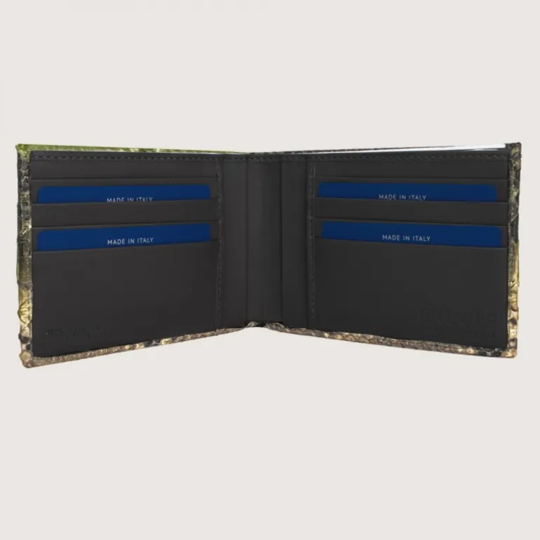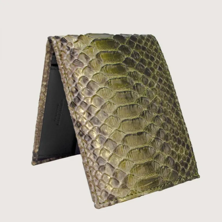 Zielony portfel z prawdziwej skóry pytona, w całości wykonany ręcznie. Wygodna i praktyczna zarówno do marynarki, jak i do noszenia w kieszeni spodni. Całość wykonana ręcznie z wysokiej jakości materiałów. Luksusowy i elegancki przedmiot. Zielony bufor w cieniu błota.